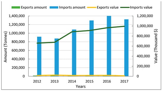 Exports and imports amount (tonnes) and exports and imports value ($) of agricultural products in Qatar (1 QR = 0.27$) (2012–2017) [17].