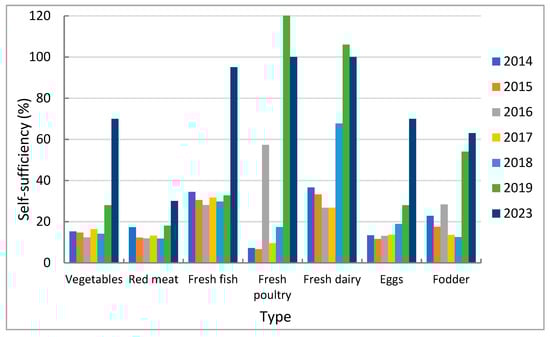 Because of Qatar’s limited resources and harsh climate, it has traditionally imported more than 90% of food requirements from more than 100 countries, like the Netherlands, Kenya, South Africa, New Zealand, India, etc. [11]. Consequently, Qatar has always been sensitive to the issue of food security and set up a National Food Security Program (QNFSP) in 2008 to reduce the state’s reliance on food imports through self-sufficiency and domestic production [18]. Since the 2017 air and sea blockade imposed on Qatar by the same neighboring countries and their allies within the MENA region who supplied the bulk of Qatar’s food requirement [11,19], the issue of food security has understandably become an acute national concern. On 5 June 2017, Saudi Arabia, the United Arab Emirates (UAE), Egypt, and Bahrain, all of which are neighboring countries and allies in the region, cut diplomatic and trade ties with Qatar and imposed a land, sea, and air blockade. The four countries claimed Qatar supported “terrorism”, had close tights to Iran, and interfered in the internal affairs of their nations. Notably, before the blockade in 2017, 27.4% of Qatar’s food imports came from Saudi Arabia and the UAE as well as 60% of dairy products. Moreover, 40% of food imports passed through Saudi Arabia [20,21]. The blockade ended on 4 January 2021. Subsequent to the blockade, Qatar rapidly developed relationships with many new food product suppliers. However, local food production was also rapidly prioritized, and the percentage of food produced within Qatar went up from 10.7% in 2016 to 11.5% in 2017 the same year as the blockade (Table 1). This was particularly true of perishable products such as vegetables and milk, which has nearly tripled [15,22] since 2017. Self-sufficiency in many food products like meat, dairy products, and vegetables has increased from 15.2% in 2014 to 28% for vegetables in 2019 with a growth of 16 local varieties, while the Ministry of Municipality and Environment (MME) has targeted ambitious goals for 2023, reaching 70% self-sufficiency in vegetables, as shown at Figure 3. It is noteworthy that Qatar was greater than 100% self-sufficient for fresh dairy products and poultry in 2019 with 106% and 124%, respectively (Figure 3).