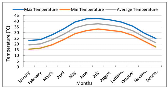 Qatar has a hot desert climate (BWh) according to Köppen’s classification [39]. Hyper-arid countries like Qatar, are characterized by sparse precipitation and high summer temperatures often experienced together with high humidity, high solar radiation, poor soil, and strong winds [17,20]. These environmental conditions present considerable problems for agricultural production and in Qatar agriculture has been traditionally limited to the months between October and April. Although, this period of production can be slightly extended for summer crops like melons, okra, and eggplants. Figure 4 shows the 10-year average temperatures over an annual cycle; starting from March temperatures start to increase, peaking in July and start to decline in August.