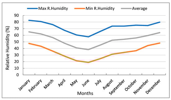 Humidity is very high as well, marking 42.5% average relative humidity around Doha International Airport in 2019 [40], with the period from November to February recording the highest rates, 60–65% on average, as shown in Figure 5 for a 10-year period.