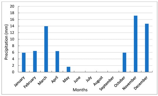 Doha Airport is located 4 km south of Qatar’s capital, Doha with a latitude of 25.25 degrees and a longitude of 51.57 degrees, while its elevation is 11 m [43]. The land next to the airport will be developed in the future, as approximately 100 hectares will host an Airport City including a free trade zone, office and business park, hotels, and a retail mall. The small amount of precipitation that does fall occurs often in the winter and spring (specifically from October to May). In 2018, torrential rain caused extensive flooding across Qatar, as it received approximately the annual rainfall amount (84 mm) in one day. This rare phenomenon was not unprecedented as it was recorded previously in 2015 and tends to become more frequent, as sudden, and heavy scattered rain hit the country every year [44]. These events which were observed in November 2015 and October 2018 were extreme. It is noteworthy that the average monthly precipitation for October was 9.6 mm and 13.65 mm for November for the reference period of 2009–2019 (Figure 6). It rarely rains during the summer months. In Qatar, the rainfall takes the form of short (and often heavy) showers that can rapidly fill the wadis (riverbeds that are dry most of the year) and cause floods and is usually less than 100 mm per year. Figure 6 shows the average rainfall precipitation over a period of 10 years. During the month of November, the average precipitation is 17.15 mm, which marks it as the month with the highest rainfall recorded over the past 10 years. Generally, from the month of October up to May (winter and spring), small amounts of precipitation are recorded; however, all year round is considered a dry season in Qatar as there is no rain season (Figure 7).
