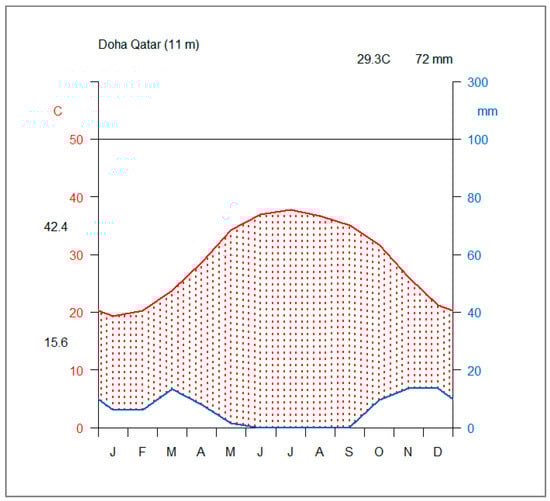 Walter and Lieth climate diagram for Doha, Qatar over a period of 10 years (2009–2019). Temperature (°C) refers to average monthly mean temperature (red solid line) and precipitation (mm) refers to average monthly precipitation (blue solid line) [40,41,42,43,46].