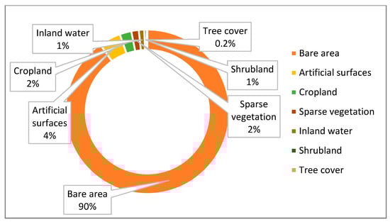 According to the OECD’s report on the land cover for 2018, Qatar had approximately 0.2% tree cover, 0.4% shrubland, 0.5% sparse vegetation, 2.4% cropland, 4.3% artificial surfaces, 90.3% bare area and 1.1% inland water of the total country area, as shown in Figure 9 [64]. The bare area (90%) includes the land use categories mentioned above, including the urban area, which was recorded as 421.17 km2 total in 2013 in the capital city of Doha [65].