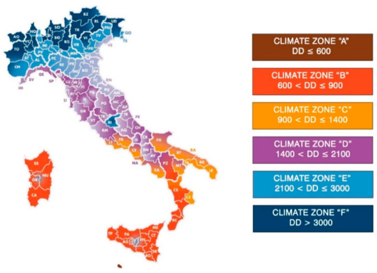 - DECRETO DEL PRESIDENTE DELLA REPUBBLICA 26 agosto 1993, n. 412 Regolamento Recante Norme per la Progettazione, L’installazione, L’esercizio e la Manutenzione Degli Impianti Termici Degli Edifici ai fini del Contenimento dei Consumi di Energia, in Attuazione dell’art. 4, comma 4, Della Legge 9 Gennaio 1991, n. 10. (GU Serie Generale n.242 del 14-10-1993—Suppl. Ordinario n. 96). Available online: https://www.gazzettaufficiale.it/eli/id/1993/10/14/093G0451/sg (accessed on 20 January 2021).