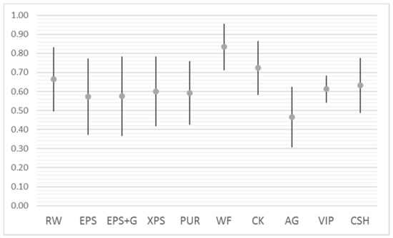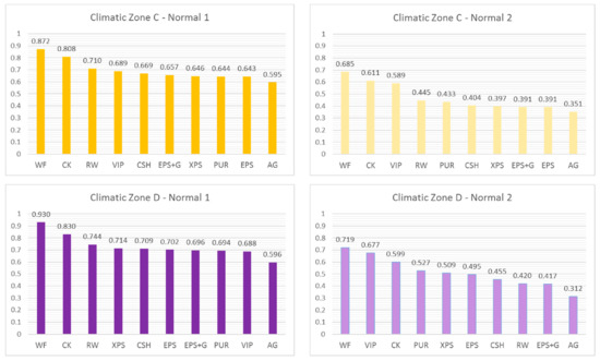 In conclusion, in order to summarise the information that can be deduced from the different applications of the method, it is possible to refer to the representation of Figure 12. This graph shows the variability range of the decision support index centred on the midpoint, whose data refer to the area climatic E and derive from the two standardisation procedures and the two 3- and 4-criteria models. It is confirmed that, in the climatic zone E with the greatest number of municipalities, wood fibre has a limited range of variability with a midpoint above the averages of the other materials. Similarly, the ETICS made with cork has an equally limited range of variability in the decision support index with an average value that ranks second after the wood fibre. It is observed that the VIPs have the lowest min–max variability range, but this is due to the ability of this material to meet the transmittance limits in the various climatic zones, always with the same thickness (10 mm). The small variation of the support index is exclusively linked to the different normalisation procedures used as well as the two different multicriteria models.