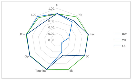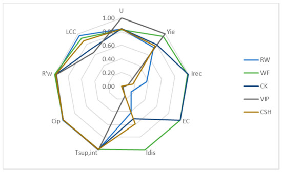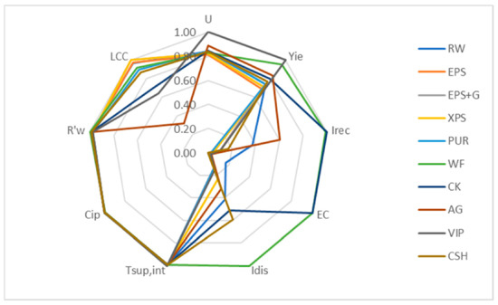 This representation is still useful if intending to further the comparison between specific alternatives: for example, it is possible to represent the alternatives that achieve the highest score globally or with respect to a single subcriterion. The graph shown in Figure 8 highlights how the use of an innovative material, namely the VIPs (Vacuum Insulation Panels), although it is performing from an energy and comfort point of view, fails to satisfy the indicators relating to the disassembly index, Idis, the recoverability index, Irec, and the simplified cost of the LCC life cycle.