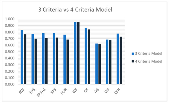 The results obtained also show the “robustness” of the methodology which, upon varying some parameters such as the type of normalisation and the grouping of the criteria (and relative weights), returns a sufficiently stable ordering of alternatives (Figure 5 and Figure 10), in any case, useful to orient the decision maker towards those alternatives that best respond to a logic of sustainability understood in its three conventional areas, environmental, social and economic. It is specified that the attribution of the relative weights took place with a view to a perfect balance between the various criteria and subcriteria. In particular, with the three-criteria model, it was intended to favour those interventions consistent with the triple declination of the concept of sustainability. Nonetheless, in relation to a different framework of decision-makers’ needs, it is possible to vary the relative weights to attribute greater importance to certain aspects that better respond to the set objectives.