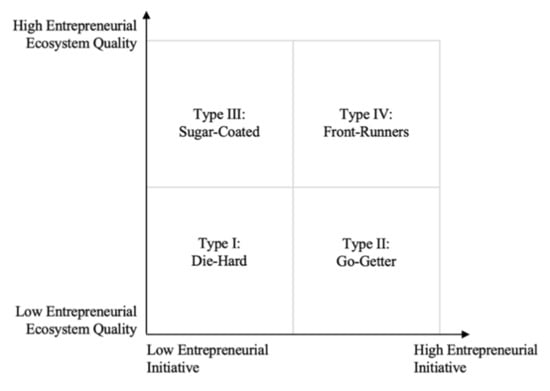 The taxonomy represented in Figure 1 offers a model that encompasses two variables—country Entrepreneurial Ecosystem Quality (EEQ) and individual Entrepreneurial Initiative (EI). The Entrepreneurial Ecosystem Taxonomy (EET) is a classification system that provides four typologies of different EEs deployed under two main sources of empirical evidence (EEQ and EI). The classification breaks the world of EEs into categories, ordering, comparing, and clustering countries without losing sight of the latent richness and diversity that exists within the type [55]. This system acknowledges that EEs are either all similar or are all individually inimitable, asserting the multidimensional nature of each typology. In this perspective, the taxonomy offers an ordered scheme, grounded on the recognition of specific similarities, consistent with previous theoretical and practical studies. Following the recommendations of Rich [55] the EEs taxonomy provides four major divisions, within the first group (Die-Hard type) and the last group (Front-Runners type) representing the lowest and the highest category levels. The specific typologies of EET are Die-Hard, Go-Getter, Sugar-Coated, and Front-Runners. Die-Hard type is considered the inferior position within EET framework and refers to countries with lower levels of EEQ and EI. The usage of Die-Hard evidence the inexorable lack of conditions and efforts to enterprise. The second position, Go-Getter, captures more ambitious individuals expressing higher EI. These economies reveal a shortage of EEs conditions and, consequently, a poorer EEQ. The third type is named Sugar-Coated and addresses countries with attractive EEs. This taxonomic position evidence limited EI opposing to outstanding context conditions. At last, Front-Runner’s type represents the leading economies in both dimensions, evidencing higher levels of EEQ and EI.