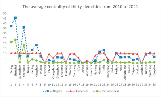 The average centrality of thirty-five cities from 2010 to 2021.