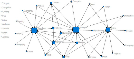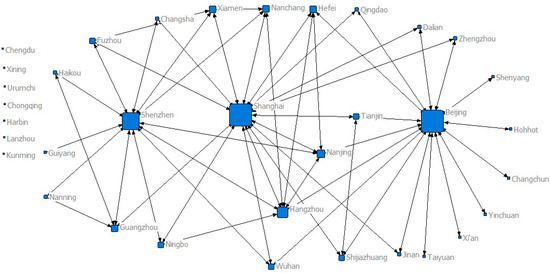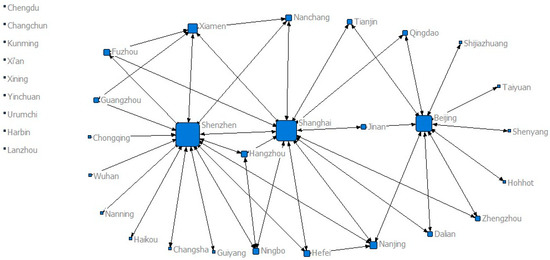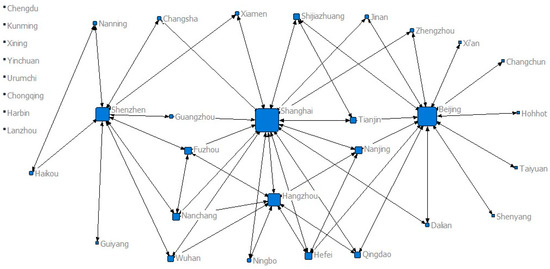 Table 3 shows that the housing price attractiveness between Shenzhen–Guangzhou is the largest every year. The housing price level in Shenzhen is at a higher position every year, Shenzhen and Guangzhou are the closest cities, which results in the greatest attractiveness between them. Because its value of Fij is greater than the mean value of positive gravity in the matrix, so it can be defined as 1 when constructing the housing price network SNA matrix. It indicates that there is a strong attraction relationship between Shenzhen and Guangzhou. Similarly, taking the 2010 data in Table 3 as an example, the largest value of negative attraction relationship between housing price is Haikou–Hefei, whose value of Fij is −6.89 × 10−9, which means that the housing price of Haikou is attracted by the housing price of Hefei. Meanwhile, because its value was greater than the negative mean value in the matrix, it is defined as 0 when constructing the SNA matrix, which means that the attraction relationship between housing price of the two cities is weak and can be ignored.