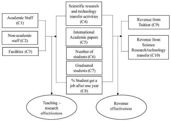 To make the study relevant for research purposes, we selected 10 criteria out of 17 in the data of public reports to the Ministry of Education and Training over two different school years. Specifically, we chose training quality assurance conditions (10 criteria), practical training quality (5 criteria), and effectiveness from financial activities (2 criteria) [43] among the three main categories of report content for analysis. To evaluate the performance of universities, this study selected the criteria that matched the operational model process, namely teaching—research effectiveness and revenue efficiency.