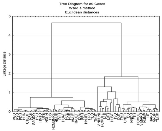 Cluster A1: TNUT, TNUEB, TNUS, TNICTU, HVU, TTU, HNUFL, HNUET, HNUE, VNUE, TUU, EPU, NDUN, HUP, UHD, HPU, HLUV, HNPU, HMTU, HUHA, SAODO, UFBA, HUE, HUS, HUAF, HUFL, HCE, HUA, HDU, NAE, DUE, UED, UFL, UTE, DNUMTP, PDU, PYU, QNU, QNUFA, DLU, UIT, HCMULAW, BUH, HCMUNRE, HCMUC, VGU, BLU, DTHU, CTEUT, TGU, and MTU (51 universities). The group had the lowest performance of the 3 clusters. However, the group strengthens the conditions ensuring quality of training and, in particular, of maintaining academic and nonacademic staff.