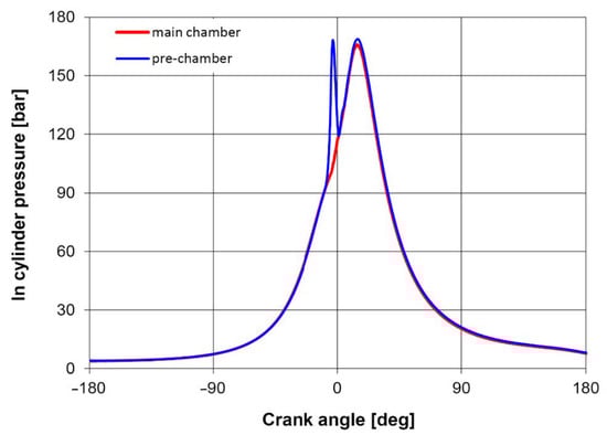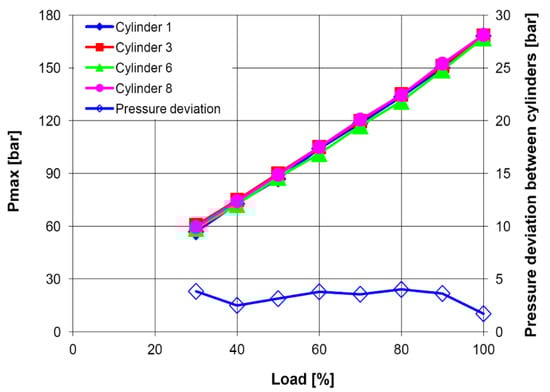 - The maximum pressure in the combustion chamber was ~16.9 MPa, which satisfied the designed pressure limits of the piston; the maximum pressure deviation between the cylinders was ~0.2–0.4 MPa, which was acceptable in accordance with engine stability.