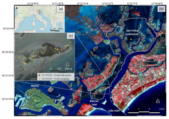 Location of the case study: (a) Venice Lagoon (North-East Italy). (b) The Lido basin, in the North of Venice Lagoon. False color image RGB bands 8/4/3 captured by Sentinel 2 on 28 February 2020. (c) Location of the field radiometry (displayed in Figure 6) and field sampling, taken 20 June 2013 in the Baccan islet.