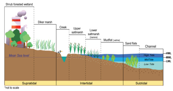 - Adam, P. Saltmarsh Ecology; Cambridge University Press: Cambridge, MA, USA, 1990; ISBN 9780521245081. [Google Scholar]