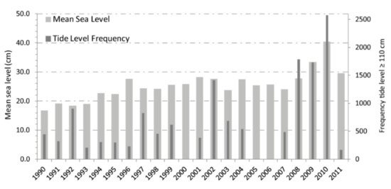 Yearly frequency of tide levels over 110 cm measured every 10 min (n of measurements) and annual mean sea level (cm). Data obtained for the Treporti and Venezia-Punta della Salute stations, respectively, for the period of 1990–2011. Source: Italian Institute for Environmental Protection and Research (ISPRA), freely available online [70].