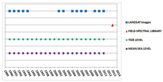The developed methodology required different kind of inputs, namely EO data, field spectral data, and the annual tide level and mean sea level for the period of 1990–2011 (Figure 4). From the United States Geological Survey Earth Explorer, 18 cloud-free Landsat images (level 1T, Top-Of-Atmosphere radiance) covering the period 1991–2011 were acquired. The images are acquired by the Landsat-4, Landsat-5, and Landsat-7 satellite platforms (Table A1) and since 1995–2000, 2003, and 2008, lack of good quality images for the June–August period of interest, and just the other years in the period of 1990–2011 are included in the satellite data series.