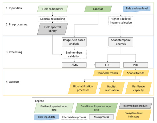 The implementation of tools for monitoring for sustainable development need to detect variables in the spatial and temporal dimensions. The methodology proposed to identify ecosystem-level indicators for state transition dynamics in the case study consists of two main processes: (i) image field-based analysis (Linear Spectral Mixture Analysis, LSMA), based on cover typologies classification and validation using field spectral sampling [53], and (ii) a spatiotemporal analysis applying the EOF and the PLD [27] (Figure 5).