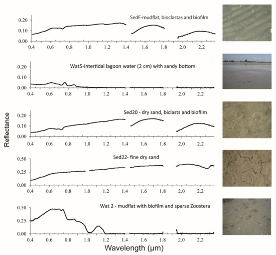 Spectral signatures of different sediment typologies in the most variable part of the study area, the Baccan island, just in front of the Lido inlet (the location of the field sampling is displayed in Figure 1).