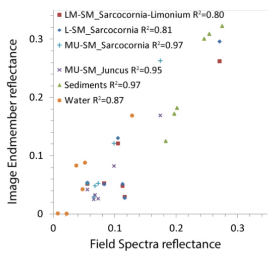 Vegetation with low reflectance corresponds to the upper saltmarsh and, more specifically, to the transition between Sarcocornia-Limonium and Juncus. On the other hand, vegetation with high reflectance values corresponds to the lower saltmarsh, specifically to Sarcocornia-Limonium and Sarcocornia (Figure 7). The identification of the different vegetation typologies (i.e., Sarcocornia, Limonium, Juncus, and Algae) is possible through the correlation between the pixel spectral signature and the field data. Above 2500 spectral bands were resampled according to the satellite sensor spectral features (i.e., the spectral bands of the sensors on board Landsat-4, Landsat-5, and Landsat-7). This procedure assures the representativeness of the endmembers in the study area. The endmembers’ validation provided well-fitted correlation for both Juncus (R2 > 0.90) and Sarcocornia-Limonium (R2 > 0.80) (Figure 7).