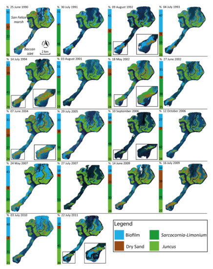 Once the endmembers are defined and validated through the field spectral library, the LSMA allows for detecting their fractional cover abundance at a pixel level (30 × 30 m). Specifically, the fraction extraction and its yearly distribution in the period covered by the Landsat images (1990 to 2011) has been analyzed for Algae-Biofilm, dry sand, Sarcocornia-Limonium, and Juncus mixture due to their representativeness spatiotemporal variation in the study area (Figure 8). Looking specifically in 1992, 1994, 2002, 2004, 2006, and 2011 in Figure 8, the spatial variation of the cover fractions within the Baccan islet, located in front of Lido Channel, it can be observed: (i) the replacement of Juncus mixture by dry sand in the period of 1994–2004; (ii) the disappearance of dry sand in a large area in the Southern part of the catchment between 2004–2006, and (iii) the presence of Algae-Biofilm in 2011 and 1992.
