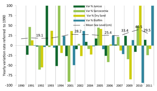 The annual rate of variation in the spatial patterns’ distribution has been quantified for all four cover typologies and compared with the mean sea level. The analysis assesses the amount of change using 1990 as reference year rather than the absolute quantity. A significant reduction of the vegetation distribution is detected after 1994 (Figure 9). This fact could be related to the increased mean sea level (changing from 22.7 cm in 1994 to 28.2 cm in 1995, and with the highest peak in the last decade of 40.5 cm in 2010) (Figure 9), and especially the increased frequency of tide levels over 110 cm (going from 125 in 1994 to 799 in 1995, with the highest peak of 3657 also in 2010) (Figure 3).