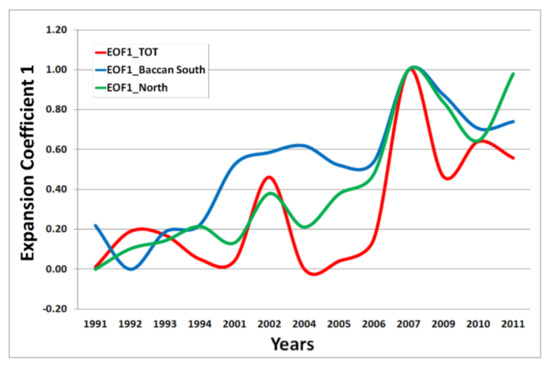 The whole study area shows a trend of growing temporal change as an increase in the EOF expansion coefficients among the studied years. Looking at the total EOF expansion coefficient 1 (EOF 1) for the upper saltmarsh—the stable part of the vegetation cover—the temporal variations are more punctual, with specific peaks in 2001–2004 and 2006–2009 (Figure 10).