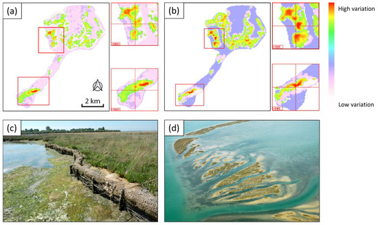 Lagoons’ ecosystems are represented by low-elevation bare flats and upper vegetated saltmarshes. These components are constantly interacting [22] and are thereby prone to continuous changes of their internal equilibrium. Vegetation’s spatial distribution stands out for its complex patterns and striking features. Particularly in saltmarshes, given the self-organization in patchy distributions [13,23,24,25,26,27,28], a key role in ecological stability and disturbance-recovery processes has been observed [29,30,31,32]. In spatially organized ecosystems, the patchiness can be generated by a wide variety of dynamics. Identifying the way vegetation, substrates and waters are distributed and organized, as well as the manner of change under the influence of the surrounding environment, provides valuable information to deduce the system’s behavior and predict its spatial dynamics. On the other hand, eco-geomorphological dynamics of saltmarshes are strongly influenced by the wide range of spatial scales of the changing processes, from few centimeters to several kilometers.