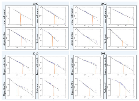 According to recent studies [40,43,44], it is fundamental to understand the non-linear dynamics observed in the power law tail, whereas the deviation in the patches’ size distribution is crucial to forecast the system response to environmental changes. It evidences the tuning of morphological restoration (mudflat-saltmarsh anthropogenic reconstruction) to the subsequent complex feedbacks between the vegetation-sediment distribution and external drivers. Recent studies in lake systems, oceans, and forests show how the gradual change is in some cases interrupted by sudden changes that determine the transition to a new state, when a threshold value in environmental conditions is exceeded [45].