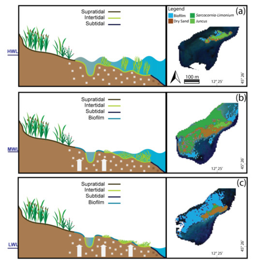 The morphological change of land processes can be fully understood as long as all the significant interactions between the physical and biological components are considered [1,2,3,4,5,6]. The role of the eco-geomorphological responses caused by the interaction between biotic and abiotic processes (e.g., vegetation growth, sedimentary processes, microphytobenthos influences, waves, tides or storm surges), has been recently recognized [7,8,9,10,11,12,13], leading to the development of new approaches. Special emphasis is given to bio-geophysical processes when studying the change of intertidal landscapes [3,4,14].