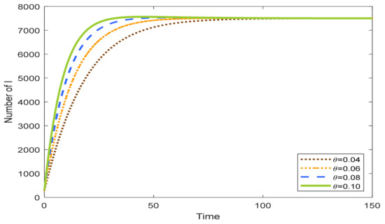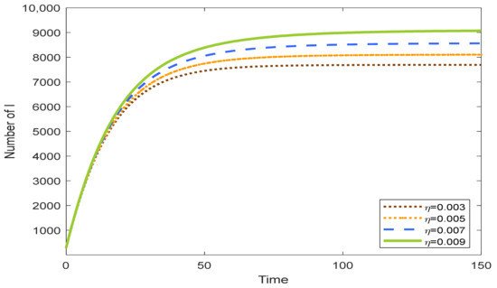 Figure 2 shows the relationship between the number of adopters of innovative green product information and the probability of advertisement propagation of innovative green products. Under the condition that other parameters remain unchanged, the probability of advertisement propagation increases, and the number of adopters of innovative green product information increases accordingly. From the perspective of advertisement strategies, initially, potential consumers choose to purchase innovative green products, and the number of adopters of innovative green product information increases; as innovative green products gain a certain market position, the number of adopters of innovative green product information gradually stabilizes. In short, when companies increase the efficiency of the initial propaganda and the advertisement intensity of innovative green products, potential consumers are more likely to receive innovative green product information; thus, the probability of purchasing innovative green products is higher.