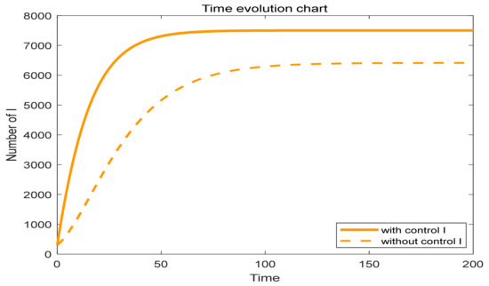 Figure 4 shows a graph of the number of adopters of innovative green product information under controlled (solid line) and uncontrolled (dashed line) conditions. Obviously, when there is control (solid line), the number of adopters of innovative green product information increases faster because when companies implement strategies, consumers can obtain product information from many aspects and thus have a greater chance to choose to purchase innovative green products. Conversely, when there is no control (dashed line), consumers cannot effectively obtain product information, and the rate of conversion into adopters of innovative green product information is slow, and the time to reach a stable state is longer. In short, when companies implement advertisement strategies and consider promotion strategies at the same time, they can improve the level of product marketing information and thus increase the market share of innovative green products.