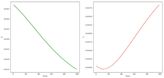 Figure 5 shows the dynamic changes in the control variables and . We observe the dynamic change in advertisement and promotion over time period and focus on 44 advertisement and promotion strategy schemes. Advertisement strategies play a leading role in the initial propagation of the influence of innovative green products, advertisement is not effective enough over time, and the probability of potential consumers turning into the adopters of innovative green product information decreases; the effect of advertisement is not good enough, and the promotion strategies gradually dominate, so the probability of promotion propagation drops first and then rises. Therefore, enterprises should pay attention to the intensity and timing of the implementation of advertisement and promotion strategies.