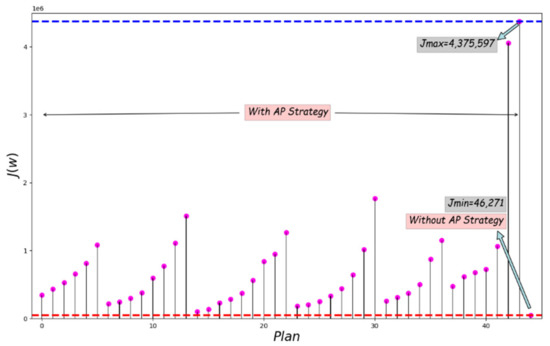 Table 2 shows the target values of the 44 allocation schemes that we focused on in Figure 5 and a scheme without advertisement and promotion strategies. We find that the target value under control is greater than that without control. This is consistent with real market conditions. Figure 6 indicates that different schemes assign corresponding target values. It contains 44 strategies and allocation schemes without an strategy and target values. As can be seen from the figure, the target value of the scheme without an strategy is the smallest, and the allocation scheme with the largest target value is (0.01,0.05), and the target value is 4,375,597.