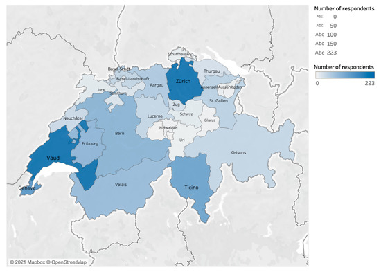 Geographical coverage/distribution of the survey respondents. Only the Canton of Obwalden was not covered. Minimum number of respondents per canton = 2 (Cantons of Glarus and Appenzell Innerrhoden); Maximum number of respondents per canton = 223 (Vaud).