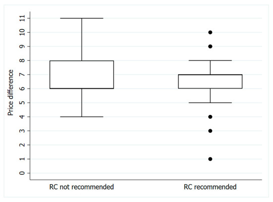 In our sample, the number of suppliers (whether only one was available, or more) did not differ between the cases in which RC was or was not recommended (Chi2 independence test results: df = 1, chi2 = 1.75, p = 0.186). Furthermore, based on the answers provided by the respondents, the actual price of RC and conventional concrete was about the same for cases in which RC was recommended and for those in which it was not. No significant difference between the two subsamples could be identified (Figure 3; Wilcoxon rank-sum test results: df = 1, z = 0.112, p = 0.911). The remaining contextual factors were input into the regression, and the results are reported in Table 6.