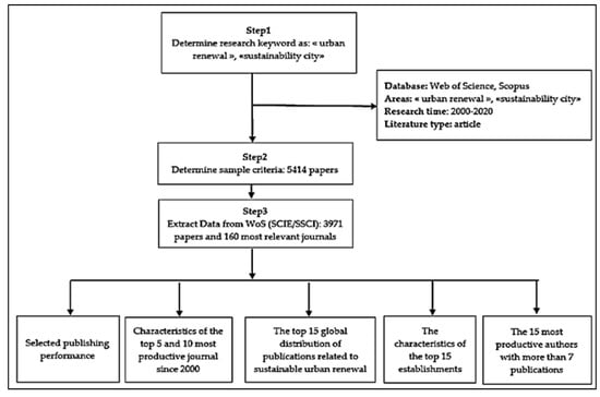 We selected scientific papers in areas related to urban renewal and sustainable development. Web of Science (WoS) is considered an essential data source for a bibliometric analysis [30,33]. To identify publications that are of interest to our research from 2000 to 2020 years, we used the following search strategy to retrieve SCIE and SSCI data (conference reports and proceedings, éditorials, and book reviews were not considered). Subsequently, “sustainable urban renewal” or “urban renewal” or “sustainable city” were selected as keywords in the context of the subject research, and were applied to titles, abstracts, and keywords of the publications. The search for literature related to sustainable urban renewal published during the period 2000–2020 in the databases mentioned above, and were retrieved as illustrated in Figure 2 on 6 July 2020.