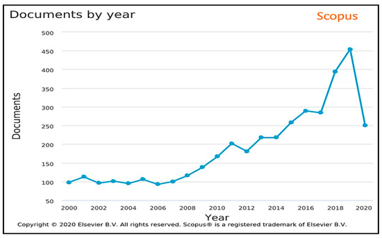 As shown in Figure 4 and Table 1, in addition to the gradual increase in the annual number of publications between 2000 and 2019, the yearly total of citations peaked six times in 2001, 2011, 2013, 2016, and 2019, then decreased during 2006, 2012, 2014, and 2017, and dropped from 2019 to 2020. The average number of annual citations increased linearly from 2006 to 2011, and from 2012 to 2019. The number of all documents published per year increased from 98 in 2000 to 454 in 2019, and then dropped to 250 in 2020. As the number of publications was estimated per year, we note a linear increase in the number of reviews since 2000 of studies on urban renewal and sustainable urban development. According to the documents reviewed about other related concepts, urban renewal and sustainable urban development remain challenging fields for researchers. Despite the exceptional progress made in this area, we note the significant potential for future research due to diminished research results in some years of study.