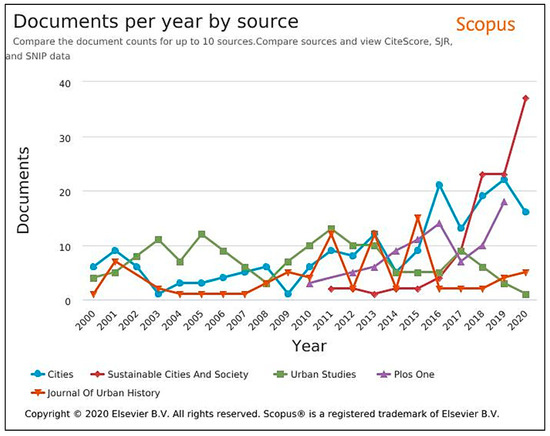 Of the 3971 publications recorded in this study of 160 data reviews (SCIE and SSCI), the top five journals were Cities (184 publications), Urban Studies (149 publications), Sustainable Cities and Society (105 publications), Journal of Urban History (84 publications), and PloS ONE (83 publications). Figure 5 shows the number of articles published in the five main categories of subjects over the study period. The 2000–2020 period was divided into seven stages, aimed at better assessing the research trend related to urban renewal and sustainability in multiple classes. For each class, the number of publications has increased and decreased over time, except in the Journal of Urban History, for which the trend of research in the field of sustainable urban renewal has not decreased. The results in Table 2 also show that the annual number of total publications has fluctuated in publications related to urban renewal, and that there is promising research progress in certain dominant classes, particularly in Sustainable Cities and Society and Cities.