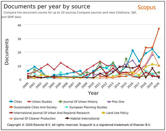 Of these articles, that written by Anna Chiesura in 2004, published in Landscape and Urbanism and entitled “The Role of Urban Parks for the Sustainable City” [36], is the most cited publication in sustainable urban renewal research during the study period of 2000–2020, with about 1043 citations. This document’s main contribution is to address the importance of the urban nature for citizens’ well-being and the sustainability of the cities they inhabit. Urban sustainability and regeneration strategies focus primarily on the urban environment’s artificial and constructed components [31,32,52]. Urban collective gardens are seen as alternatives to address the environmental problems generated by urbanization [53], thus contributing to cities’ sustainability [48,49,50].