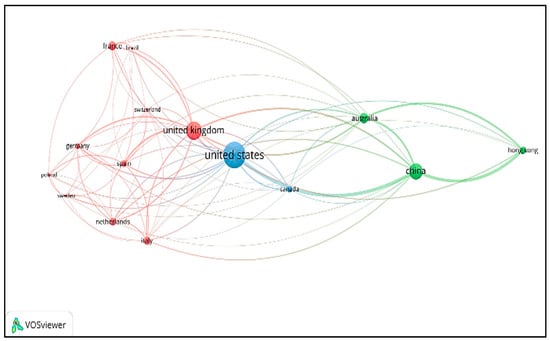 The academic cooperation between the 15 international institutions of the most productive countries is illustrated in Figure 8. We used VOSviewer (a visualization analysis tool) for data processing. It is evident in Figure 8 that the United States, the United Kingdom, and China are the three most productive countries and have a cooperative relationship. The United States is the most active country in terms of international cooperation, notably with China (35 documents), the United Kingdom (16 papers), Hong Kong (5 papers), and Australia (6 papers). The United Kingdom has also actively cooperated with other countries, such as China (12 documents) and Spain (13 papers). Finally, China has also collaborated on this subject with a number of countries, such as Hong Kong (30 documents) and Australia (16 papers). This close cooperation of countries with a large number of academic publications indicates a close relationship because researchers can easily find potential research partners from these countries because of their similar research interests. In essence, this international academic cooperation has strengthened their research capacity and improved sustainable urban renewal studies.