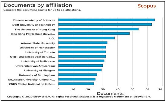 Figure 9 and Table 4 show the 15 most productive institutions relating to sustainable urban renewal studies since 2000. The Chinese Academy of Sciences ranks first with most publications, then the Delft University of Technology, followed by two Hong Kong Universities, and UCL. This indicates that British institutions (UK) made significant contributions in international cooperative relationships, followed by Chinese institutions, in terms of research trends in urban renewal and sustainable urban development.
