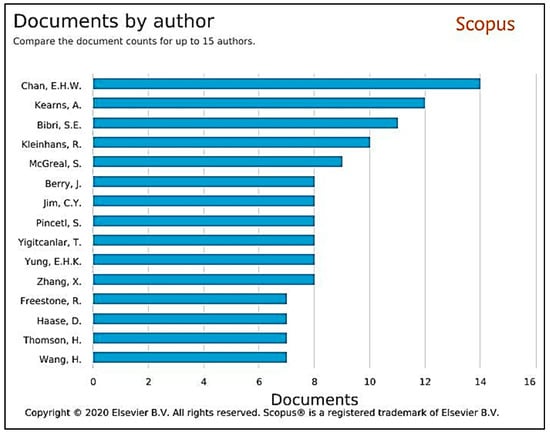 A total of 156 authors published articles on urban renewal and sustainable urban development during the study period according to the SCCI and SCI databases. Chan, E.H.W. was the most productive author, publishing 14 articles. Kearns. A published 12 papers and ranked second. Bibri. S.E ranked third with 11 papers and Kleinhans. S.E ranked fourth with 10 articles. Six authors published nine articles each (Figure 10). However, most authors (83.31% of all authors) contributed from three to five papers, which indicates that a small number of researchers have made substantive contributions to this field.