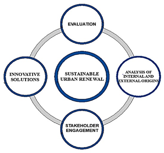 A more realistic goal for urban planning is to reduce the negative effects of urban problems as much as possible, and the negative consequences of urban fragilities from a sustainable development perspective. Urban renewal is a deliberate effort to change the urban environment [23] through a planned and large-scale adjustment of existing urban areas to meet the demands on human life and urban work [21]. It is an essential answer to the decaying nature of ageing cities and the ideal concept for the current development of sustainable cities through various actions.