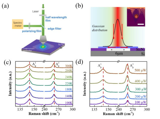 To find the anisotropic thermal conductivity, we employed an MRT method to systematically study the thermal conductivity of 2D PdSe2 [26,29,30]. Figure 2a shows the schematic diagram of the experimental setup, in which the polarized light was focused on the center of the hole, while the polarization direction of incident light was controlled by a rotating half-wave plate. The heat input and diffusion by the laser beam was subject to Gaussian distribution. Most heat was concentrated at the center of the suspended PdSe2. The results provide a convenient way to obtain the temperature-related phonon information. To achieve high precision, the hole under the sample was much larger than the laser spot, which can minimize the substratum’s influence and establish an appropriate temperature gradient from the hole center and the substrate. In our experiment, the hole diameter was 6 μm, which is adequate and much greater than the laser spot (about 2 μm); a typical suspended PdSe2 is shown in the inset of Figure 2b. Then, we employed a temperature-dependent Raman spectrum under parallel configuration to obtain the temperature meter, reflecting Raman spectra’s sensitivity to temperature. Embodying the temperature sensitivity of phonon vibration in PdSe2, the two most apparent Raman peaks of 7.2 nm PdSe2 are highlighted in Figure 2c. With the temperature increase from 100 K to room temperature, both the (145 cm−1) and (256 cm−1) modes’ peaks had a dramatic redshift, which originated from thermal expansion and anharmonic lattice vibrations [41,42]. Similarly, with the increase in laser power, the peaks of and modes also exhibited significant redshifts because of the laser heating effect, as shown in Figure 2d. In order to intuitively show the shift in peak position with temperature and power, we fit the peaks of and modes in Figure 3. The two peaks exhibited the same trend. The peak was more apparent than the peak, and the former’s redshift was more remarkable. This result indicates that mode is more sensitive to temperature, so we selected the peak shift on a microscale as the temperature meter.