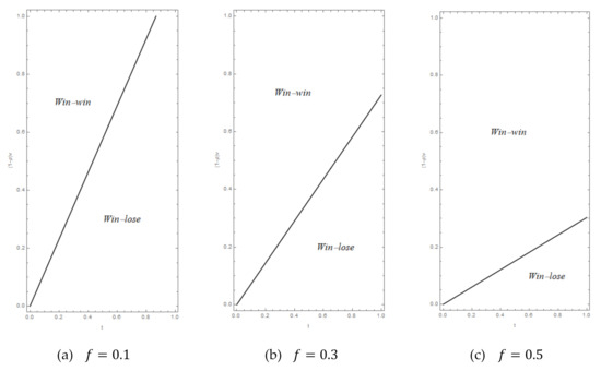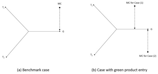 We firstly solve M1’s problem, given , which leads to the response functions (i) if and (ii) if , that is, this case degenerates to the symmetrical case. Then, we solve M2’s problem leading to (i) if and (ii) if , that is, this case degenerates to the symmetrical case. By combining the above cases, it yields that and should sustain simultaneously, which leads to and ; under which the constraints of and can never be satisfied, hence there is no asymmetrical equilibrium exists. That is, both manufacturers will not deviate from symmetrical equilibrium.
