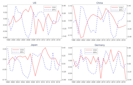 Notes: (1) The data sample covers the period 1998Q1 to 2019Q4, the source of CO2 is the World Bank, and the data of EPU (economic policy uncertainty) is from https://www.policyuncertainty.com/ (accessed on 1 March 2021). (2) CO2 emissions and EPU of the United States, China, Japan, and Germany are all the fluctuation values after HP Filtered (λ = 100). (3) CO2 emissions of the four countries adopt the logarithm of per capita CO2 emissions, and the EPU of the four countries adopt the logarithm of the EPU index. (4) In the figure, the red solid line is calibrated with the ordinate left axis, and the blue dotted line is calibrated with the ordinate right axis.