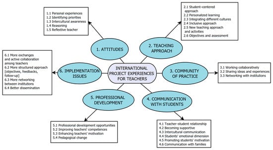 The literature regarding the effects of attending international projects on intercultural education and education for sustainable development (ESD) has focused on improvements by students during intensive programs or summer schools [7,25], with less research considering the effects on teachers, which is the central emphasis of the present study [6]. Alfaro and Quezadab [6] examined 21 biliteracy teachers who studied and taught in schools through an eight-week in-service professional development program with indigenous Mexican children and underlined the need for providing support in ethnically diverse settings. Dooly and Villanueva [7] proposed an international training program for trainee teachers. The students were presented with a blended course focused on intercultural communication that aimed to develop awareness of intercultural issues and offer opportunities for critical reflection. The outcomes of the project highlighted the promotion of negotiating and reflection skills among participants, who recognized the importance of the intercultural dimension for their future educational activities.