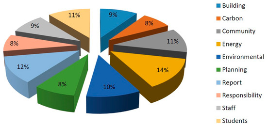 As evident in Figure 3 above, the term energy enjoyed the highest degree of reoccurrence (14%). Energy, in this context, referred to the strategic goal of the university to substantially reduce energy costs over time. This complemented its objective of ensuring financial sustainability. In contrast, carbon enjoyed the lowest level of reoccurrence, which indicated that the context of energy identified earlier has more to do with cost than carbon reduction.
