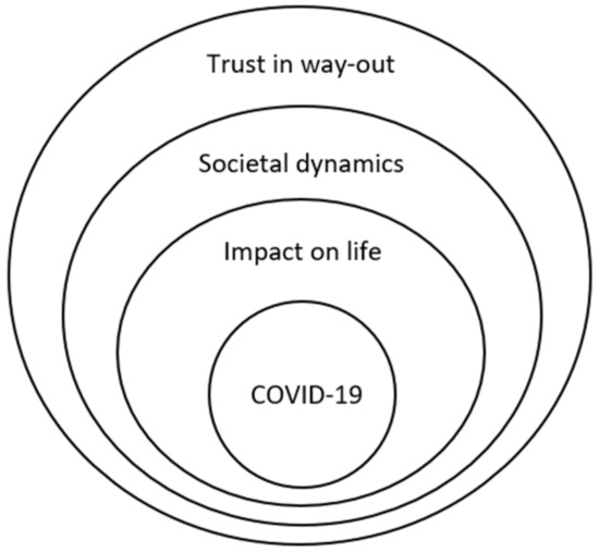 Reviewing the literature about the effects of COVID-19, we distinguish four layers in people’s perceptions of and experiences with the pandemic (Figure 1). At the core is the COVID-19 virus itself. Largely based on media reports and discussions with others, people form an idea of the dangers of the virus. Some earlier studies found that fear of the virus (sometimes operationalized in terms of perceived severity and perceived contagiousness) may play a significant role in people’s mental health and well-being [13,19]. This aligns with the abovementioned personal characteristic of risk salience. However, both studies were conducted in the early phases of the pandemic. It is imaginable that people’s risk perception decreases over time due to a process of habituation [50].